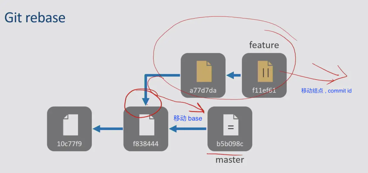 - 再移结点: 把 feature 分支上新增的提交 commit id ,放到新的 base 结点后面。准确一些,就是把 feature 分支上新做的修改操作,重新应用到 master 分支的 HEAD 结点上。