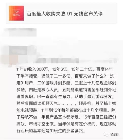 “11年91收入300万,12年6亿,13年20亿。百度14年下半年接管,还做了二十亿。百度来做了什么?一,洗走91用户;二、91游戏并到多酷;三、账上十几亿现金移到多酷;四,赶走核心人员;五、商务渠道销售全部赶到外地逼着离职。91一直都有生命力,从助手做到游戏分发,然后桌面阅读视频天气……预装机,甚至搞上智能电视预装,11年到15年每年都能推出十几个项目。除了导航不做,手机产品基本都涉足。15年百度已经把91市场搞残,市场才空出来。当年91是有定价权的,现在移动行业玩的基本还是91玩过的那些套路”。