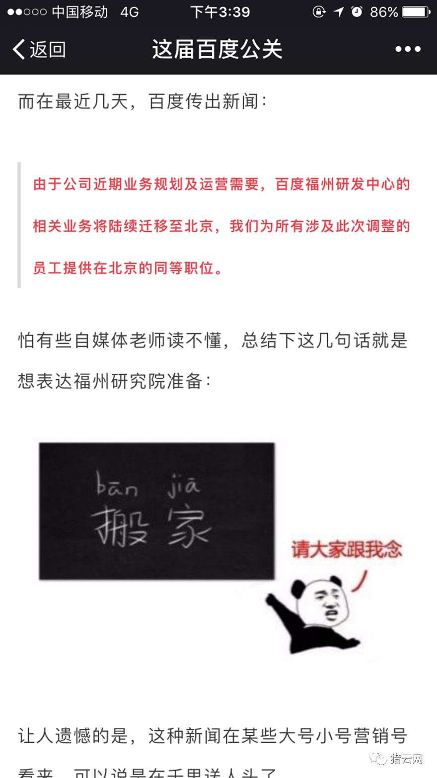 而按照员工所说,福研此次解除劳动合同的人员在200余人,目前仅不到十人接受了“平移”至北京,且所有高管无一幸免。这样搞突然袭击且当天就让多数员工直接结束工作的行为,大概就是百度官方坚称“是搬家不是裁员”的原因了吧,因为搬家并不需要去劳动局备案。这也是员工目前觉得失望和愤怒点的之一,“明明违法裁员,却还对外咬定搬家”。而关于彻底退出福州市,百度总部法务内部解释“已经和当地政府相关部门打过招呼”。