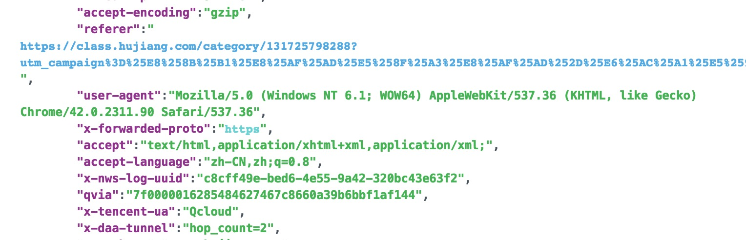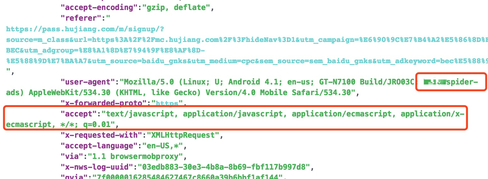 为了保障性能,我们的 Node 端并没有详细记录每个请求,所以单纯看406的日志并不能知道具体的原因。为了排查这个问题,我们紧急发布了在线补丁,具体记录每个请求的详细信息,然后在日志平台中看到了下面的请求