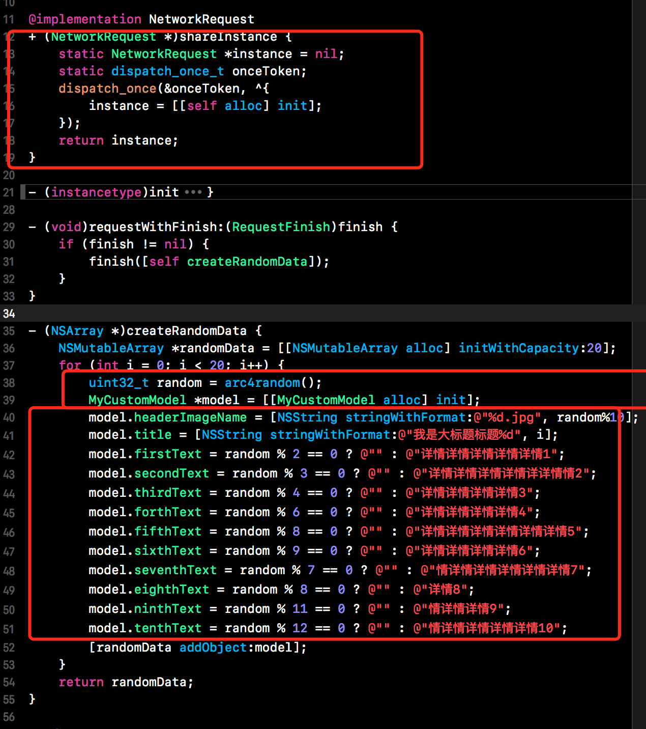 上面Cell中显示的数据是通过模拟网络数据来获取的,下方就是我们的模拟网络层的相关代码。毕竟是Demo,并且Demo的重点不在网络层上,下方就简单的写了一下,代码比较简单。就是一个单例+一个模拟数据随机生成的方法,然后把这个随机生成的数据通过Block回调到网络层的使用者上。具体代码如下所示: