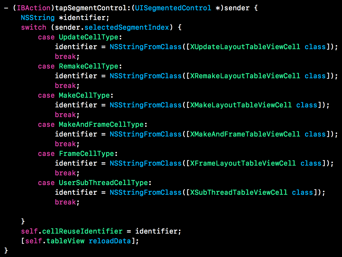 下方是在相应的VC中的点击SegmentControl的逻辑代码, 点击不同的Segment会选择不同的Cell然后刷新TableView,代码比较简单就不做过多的赘述了。