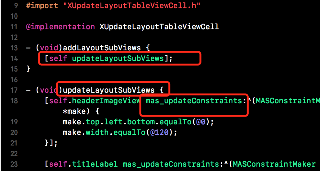 我可以先看一下代码实现,在子类XUpdateLayoutTableViewCell中,重写了addLayoutSubviews和updateLayoutSubviews两个方法。在updateLayoutSubviews方法中,为所有的控件使用update的方式添加约束。下方这样写会在每次设置值的时候都会调用下方的updateLayoutSubviews方法,这样就会更新cell上的控件的所有布局,当然,不建议这样去做,因为这样会更新那些不需要更新的约束。之所以今天罗列出来,是因为在开发中下方的问题确实存在,也许是因为时间紧张,也许是因为其他原因导致的下方这种代码实现。