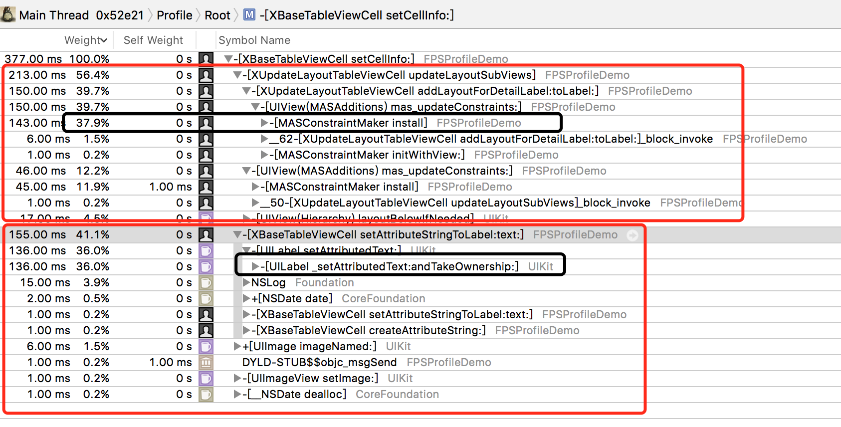 我们可以来跑一下Update状态下的Time Profile。如下所示,从下方的结果中不难看出,在Cell更新数据时,有两块的操作比较耗时。一个是Masonry的update操作,另一个则是Label设置NSAttributedString的操作。因为我们使用的每个Label都会赋值一个属性字符串,这个是比较耗时的操作。还有一个要明确一点的是,属性字符串的创建和生成并不会占用多少时间,而属性字符串的赋值和渲染所占用的时间是比较多的,这一点从下方的 Time Profile中也是不难看出的。