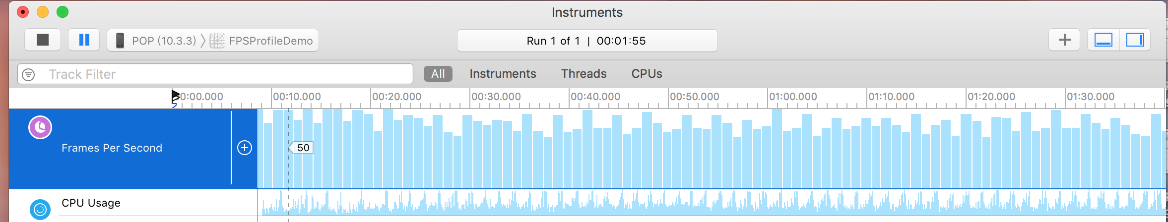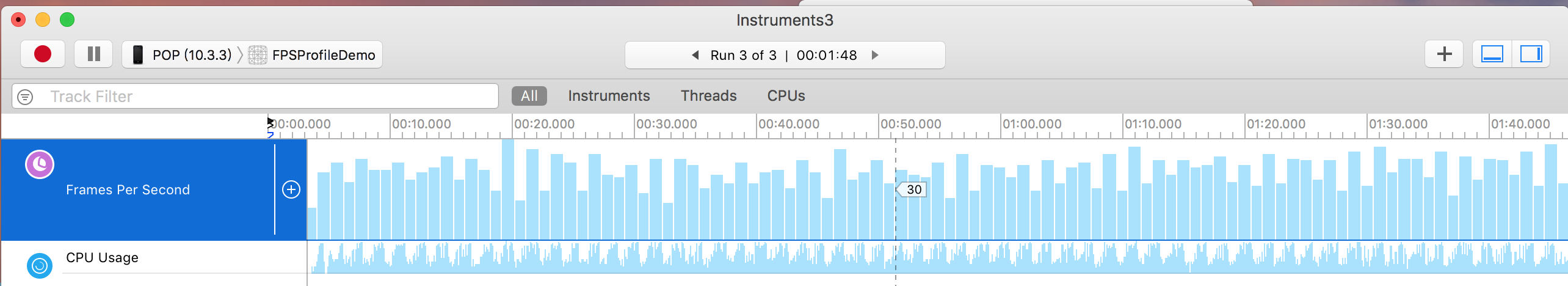 我们先来使用Instruments跑一下上述的Demo,然后直观的感受一下该Demo的Core Animation的直观表现。下方就是我们将SegmentControl切换到Update时所对应的FPS数据。从下方的数据我们不难看出,直接用Update添加更新约束这种做法是比较影响FPS的。当然,Cell中还会使用到属性字符串,这个我们稍后会讨论一下的。