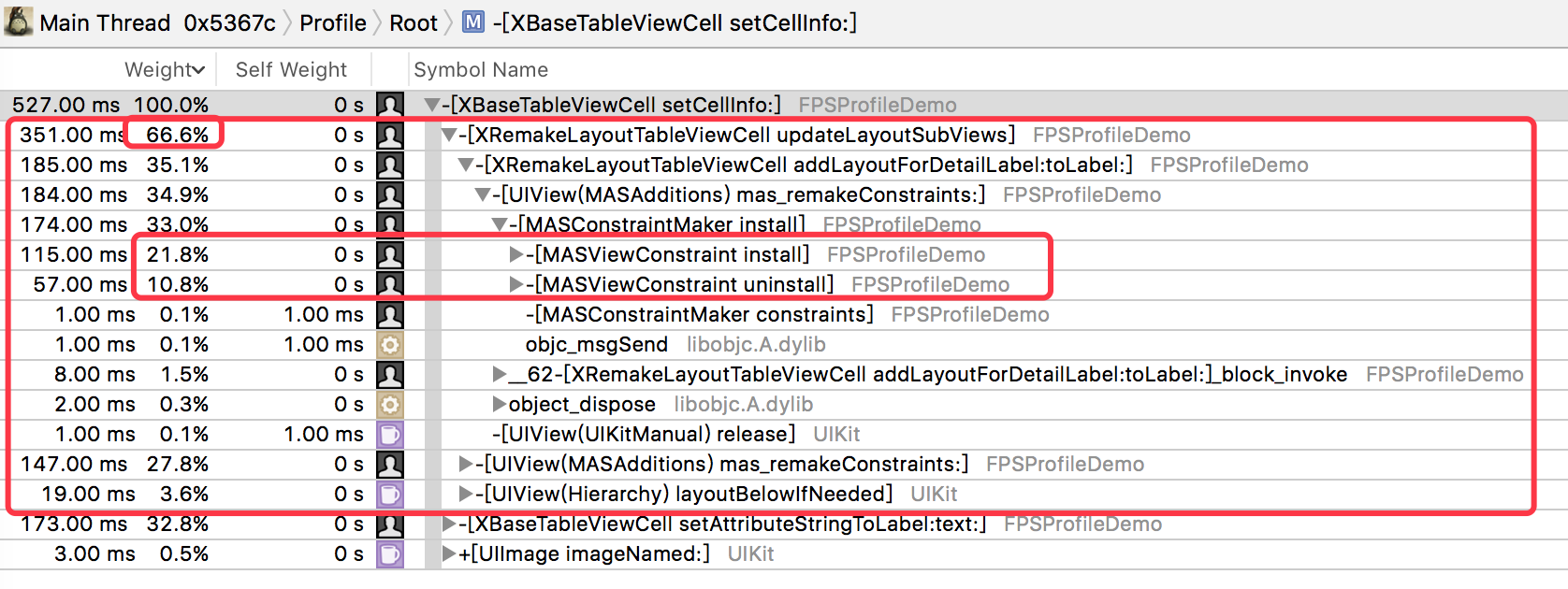 接下来要做的事情就是分析一下每种布局方式对FSP的影响,下方会对不同的布局情况使用Instrument进行分析并看一下具体的数据。下方分别讨论了只使用Masonry的Update操作、Remake操作、先Make后Update、Frame操作以及先Make后Frame操作。