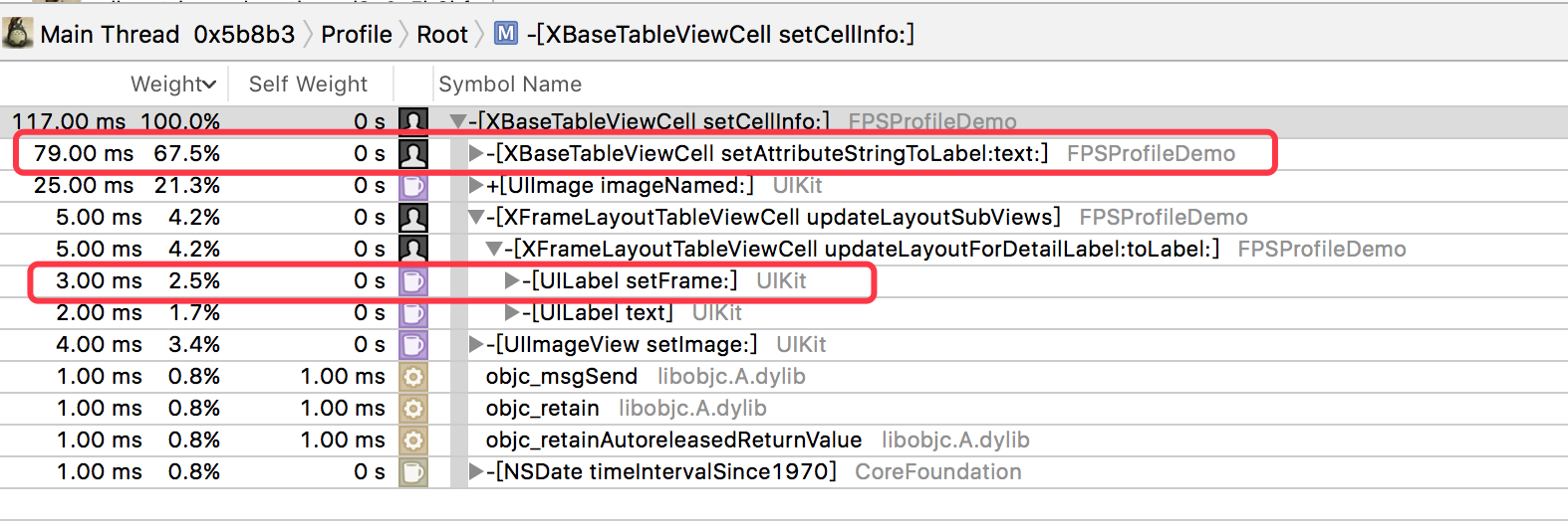 我们可以看一下更新Frame的Time Profile,如下所示。从下方的截图中,我们不难看出update frame的时间占比只占到了2.5%,之前更新约束能占到60%左右,可以看到使用Frame布局的好处。从下方的分析结果中不难看出,现在影响FPS主要因素已经从更新布局转化到了AttributeString的设置。这也是上述FPS没有满格的原因。