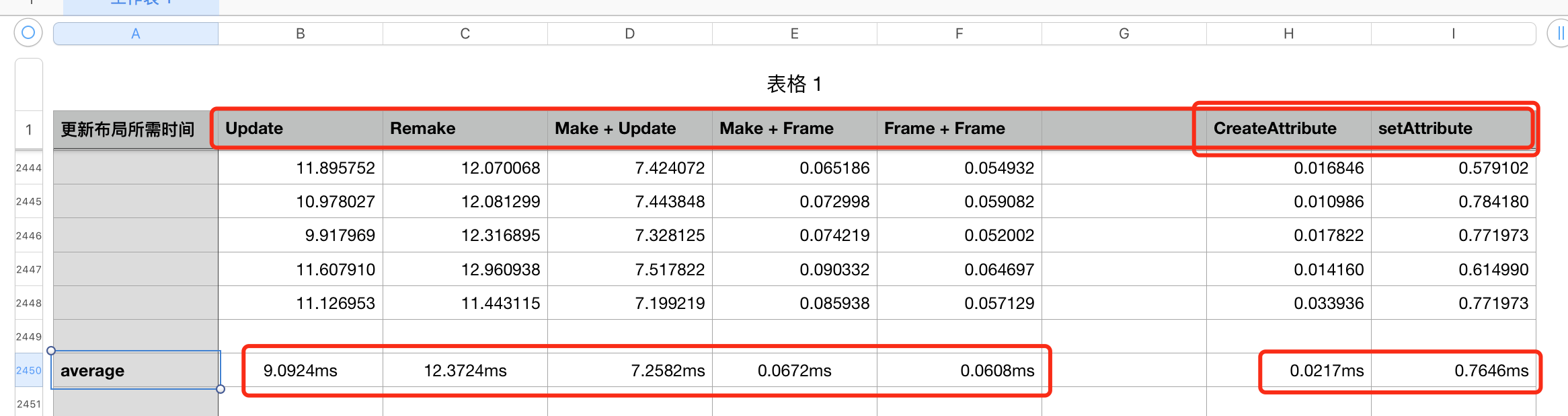 下方是我们在代码中更为细化的数据,从数据中不难看出Remake的性能是最差的,所以我们在使用Masonry时尽量要少使用Remake。对控件的更新只一味的选择使用Update也不是一个好的选择,如果要使用Masonry框架还要对控件进行布局更新的话,最好是把那些不变的约束和需要更新的约束分开。使用make来添加相关约束,使用update来修改需要更新的约束。当然使用Frame布局的性能会好一些,不过布局过程过于繁琐不便于进行屏幕的适配。当然也可以使用Masonry进行布局使用Frame进行布局的更新,当然需要注意的是Frame布局更新的时机,需在Autolayout加载的时机后进行。