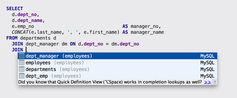 DataGrip提供上下文敏感的代码感知功能,帮助您更快地编写SQL代码。代码感知功能可以感知你正在编辑的代码中创建的表结构,外键,甚至是数据库对象。