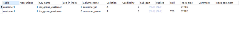 这就为customer_id、customer_name两个字段成功创建了一个名为idx_group_customer的组合索引,通过SHOW INDEX FROM customer1; 将会看到两条记录(附图)