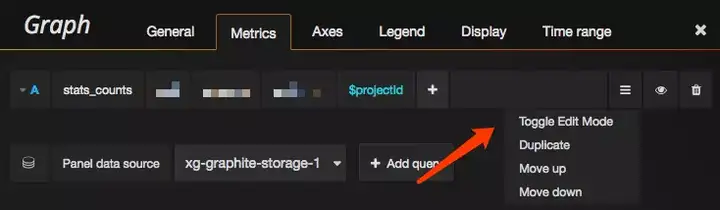 以 Editor 权限的账号进入到任意面板中,点击某个图表继而点击小弹窗中的 Edit 按钮,即可进入图表的编辑器界面。对于编辑器本文只介绍图表的重要配置,Metrics,Legend 和 Display