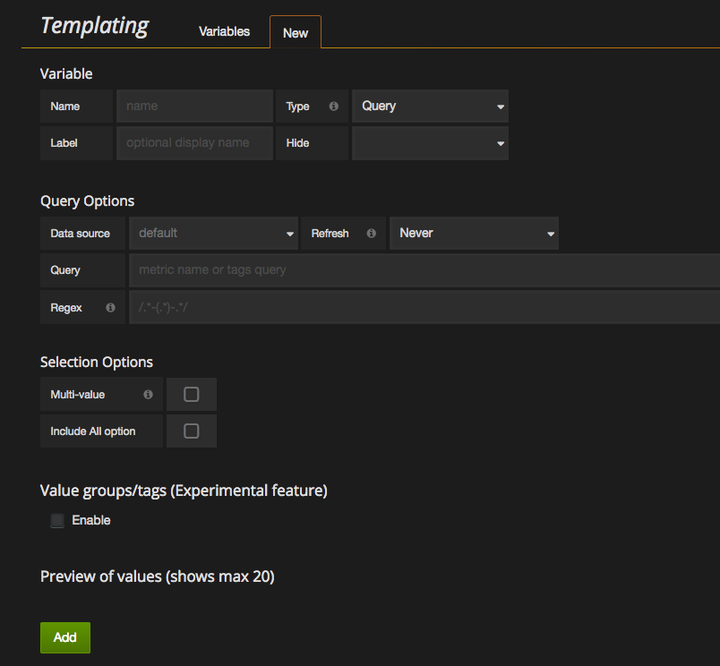 Grafana 界面上齿轮按钮 -> Templating -> 点击 New,即可出现类似如下的界面: