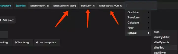 以 graphite 为例子,打点路径中的 KEY 只支持大小写字母、数字、中划线和下划线,这会导致前端的路径(经常包含 # 和 :path)存不下来,因此我们只能提前转译,例如将 # 转译为 ANCHOR,将 :path 转译为 PATH ,再将 / 转译为 -,这样在变量模板中展示的就是比较怪异的前端路径,不过好在我们有函数,可以在界面上把它替换回来。