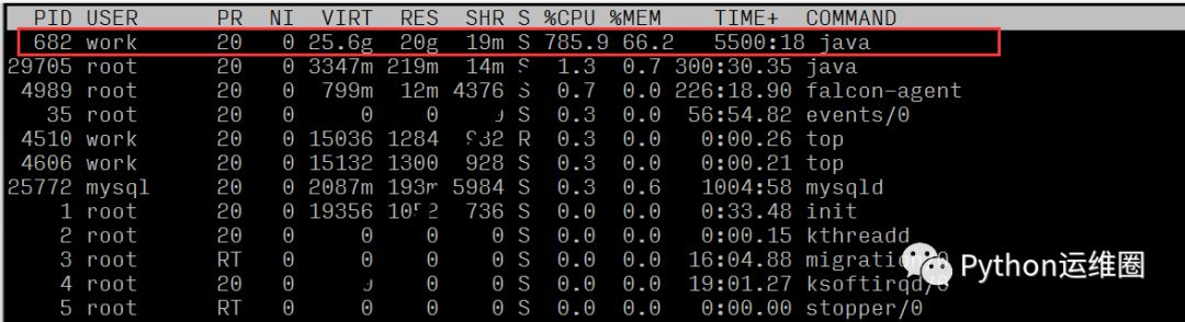 观察各个进程资源使用情况,可以看出进程 id 为682的进程,有着较高的 CPU 占比。