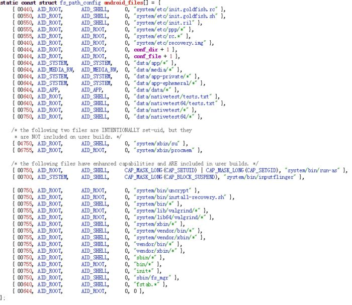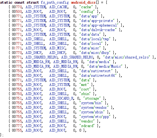 file 事实上是在文件系统创建时对目录和文件设置了相对应的uid、gid以及权限,这里涉及到一个重要文件 fs_config.c对目录的定义: