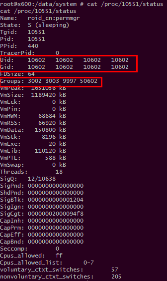 "cat /proc/xxx/status"查看进程信息,包括uid、gid、groups