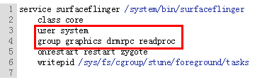 System Process我们知道在init进程的最后阶段,核心系统服务servicemanager、vold、surfaceflinger等进程都会被启动,他们的uid、gid也都是通过相应的.rc文件指定的。就拿suerfaceflinger来说,surfaceflinger.rc.