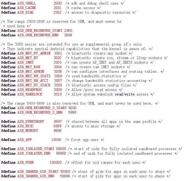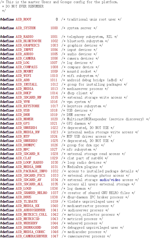 App Process每个app安装之后被分配uidUsers、Groups 在android中定义 android_filesystem_config.h