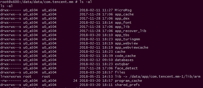 我们可以看到熟悉的身影:AID_ROOT 0AID_SYSTEM 1000AID_SHELL 2000而对于正常的app will be assigned AID above 10000, and the GID、UID will be the same as AID.以微信为例,微信的data目录权限如下: