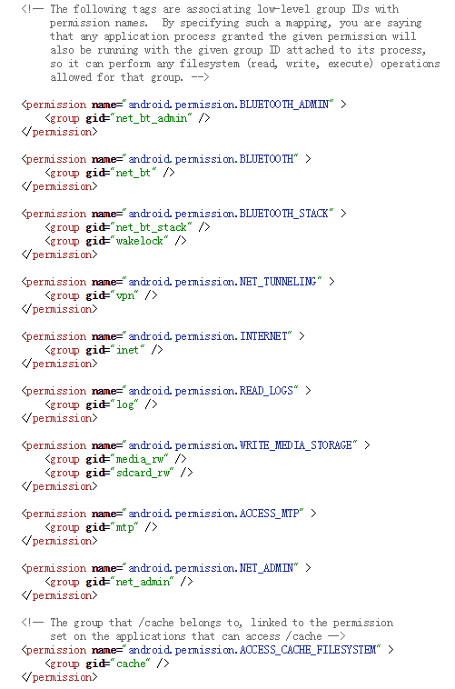 我们看到这些文件的uid、gid都是u0_a504,这个u0_a504前半部分u0是userID,后面a504是根据微信安装后系统分配id为10504。因为这个id是唯一不重复的,只要不卸载那么10504就只能是微信uid,因此也只有微信的进程uid/gid = u0_a504,也就是说只有微信的进程可以访问微信data目录下的文件,这就保证了app私有数据的独立性与安全性。那么除此之外,还有什么方式可以获取权限来访问文件呢?这就和上层的permisson扯上关系了。 其实核心文件是:platform.xml