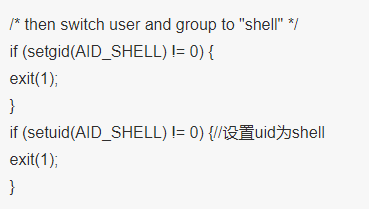 我们再回头来解释一开始说到的adb shell xxx进程uid的问题。通过ps命令我们可以追溯一下adb shell进程父子链:init -> adbd -> /system/bin/sh -> xxx我说的shell进程即 /system/bin/sh事实上init进程的uid是root,那么正常情况adbd后面进程也都应该是root啊,为什么从adbd开始uid就成了shell呢?这一度也是我疑惑的地方,看了adbd源码发现原来adbd对uid、gid另外进行了设置。adbd流程节选: