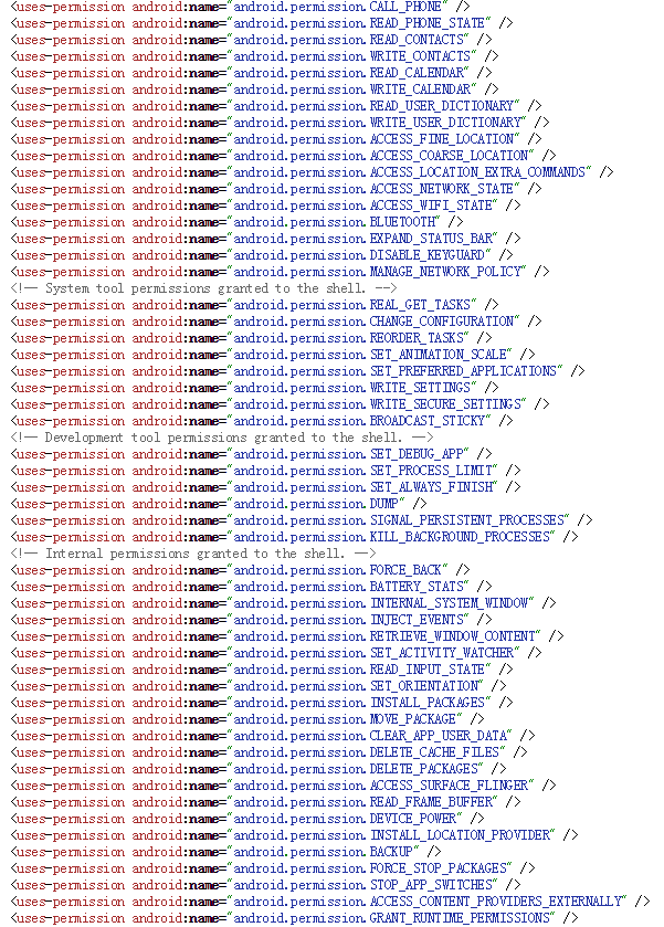 我们看到几乎所有的permission都在shell包里声明了,因此adb shell可以说是权限之王(个别权限也没有,否则你把root搁那>_<)。