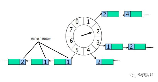内部使用数组模拟类似时钟的环形数据结构,每一个格子代表一个时间间隔,每个格子对应一个任务的链表,在添加过期任务时,通过过期时间和当前时间计算出任务应该在第几个格子里并计算应该是走到第几圈时触发超时。
