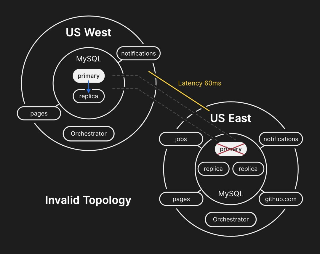 美国东海岸数据中心的数据库包含了一小段时间的写入数据,这些数据尚未被复制到美国西海岸的数据中心。由于这两个数据中心的数据库集群包含了其他数据中心不存在的数据,因此我们无法安全地将主数据库转移到美国东海岸数据中心。
