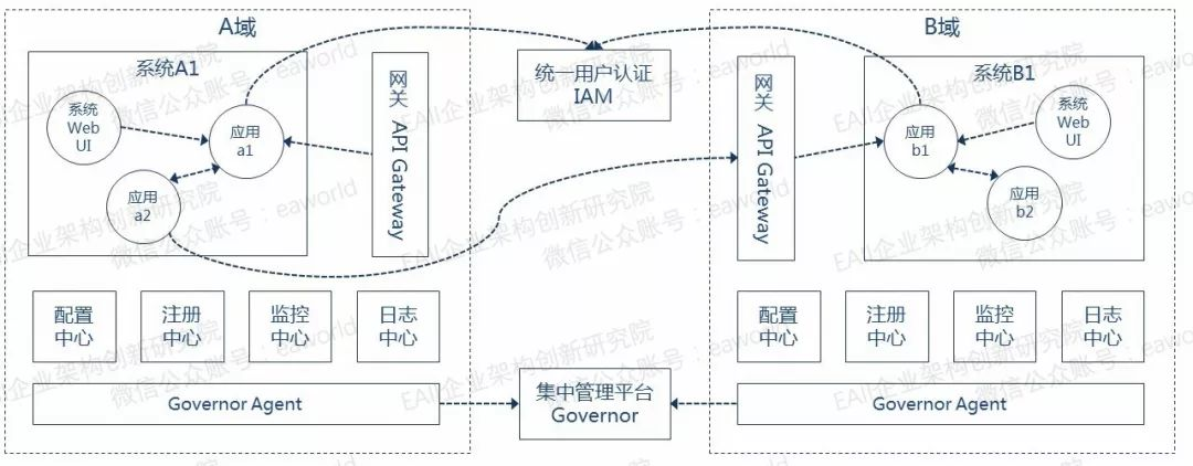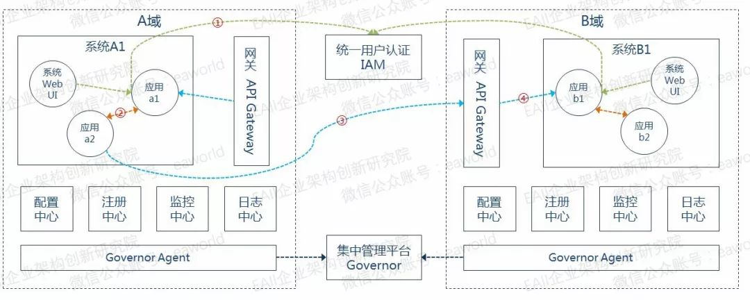 ③:表示跨系统调用。由于空间有限,每个域只画了一个系统,所以图中所示的跨系统调用同时也跨了域。如果是域内跨系统服务调用,则需要调用本域网关发布的服务