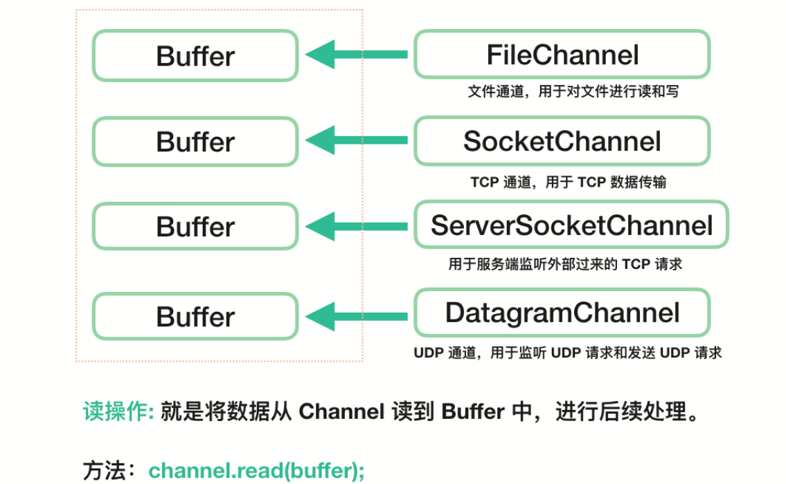 Channel 经常翻译为通道,类似 IO 中的流,用于读取和写入。它与前面介绍的 Buffer 打交道,读操作的时候将 Channel 中的数据填充到 Buffer 中,而写操作时将 Buffer 中的数据写入到 Channel 中。