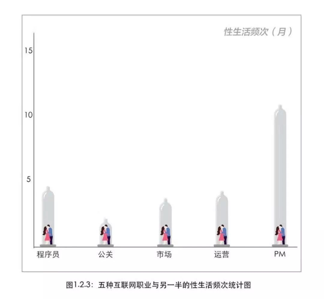 作为恋爱生活的重要组成部分,报告竟然还统计了各职业性生活的频次。报告中竟然显示 PM 的性生活频次是最高的!!!
