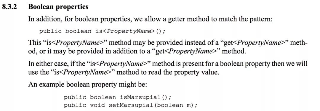 关于Java Bean中的getter/setter方法的定义其实是有明确的规定的,根据JavaBeans(TM) Specification规定,如果是普通的参数,命名为propertyName,需要通过以下方式定义其setter/getter: