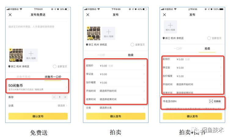 在闲鱼,各种业务所需要存储的东西大同小异,从闲鱼的发布界面上来看就不难发现这一点,都是在基础对象(如标题、描述、图片)之外添加一些业务相关的数据,如拍卖业务中指定拍卖的开拍时间等信息,免费送业务中设置兑换币值,图书业务上设置条形码。即对一本图书进行拍卖当然也是允许的,这就出现了拍卖业务和图书业务叠加起来的复合型业务。
