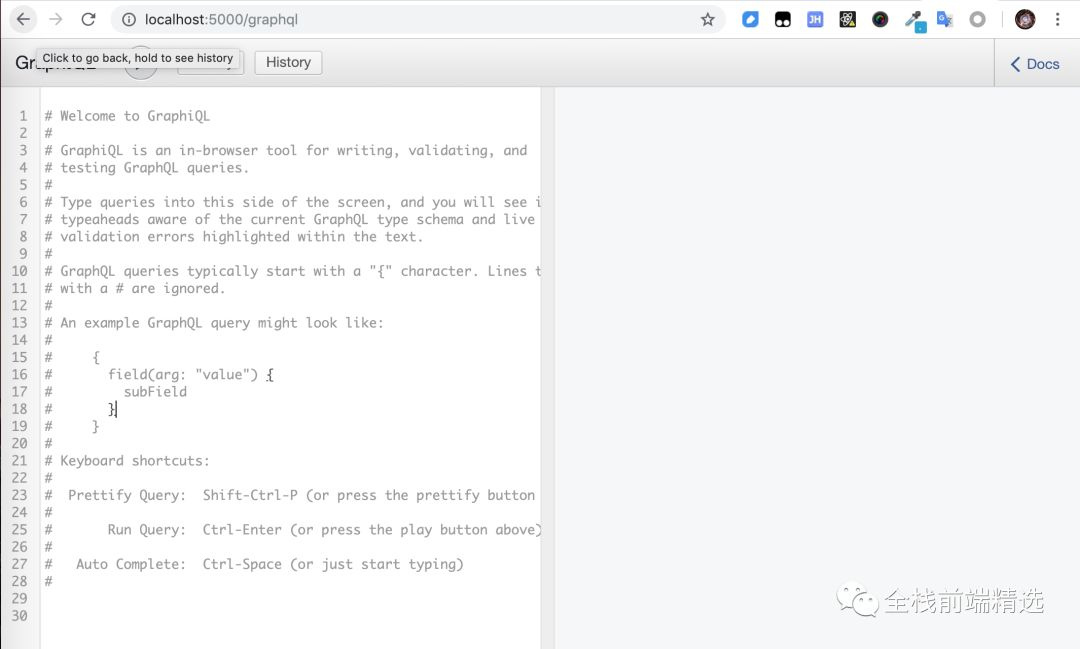 完成这一步,服务端api基本搭建完成!我们看一下效果,在浏览器中输入 http://localhost:5000/graphql 将打开 Graphiql(生产环境建议禁用):