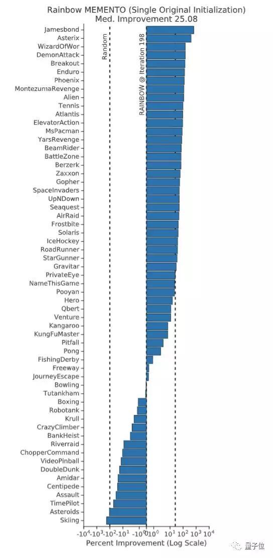 上面这张图中,每柱对应一个不同的游戏,其高度代表Rainbow Memento智能体相对于Rainbow基线增长的百分比。