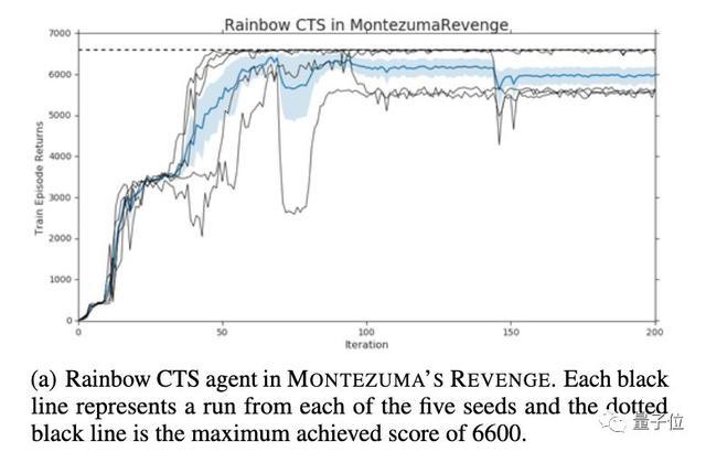 研究人员观察到,CTS模型计算的Rainbow智能体,会在6600分的时候到达瓶颈。更长时间的训练和更大的模型大小都不能有所突破。