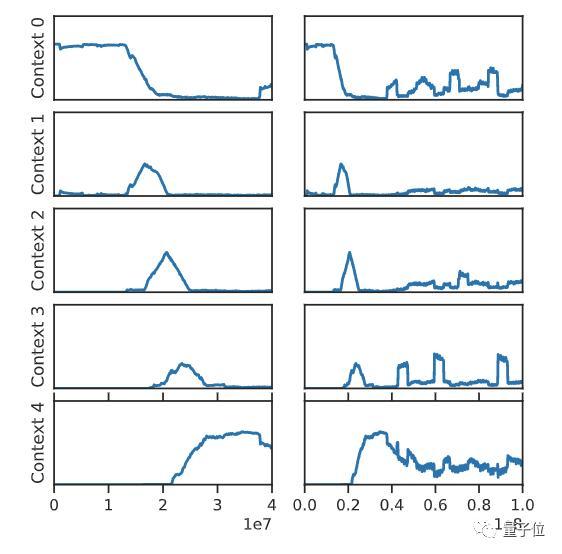 在训练早期(左列),因为尚未发现之后的环节,智能体总是在第一阶段进行独立训练。到了训练中期,智能体的训练开始结合上下文,这就可能会导致干扰。而到了后期,就只会在最后一个阶段对智能体进行训练,这就会导致灾难性遗忘。