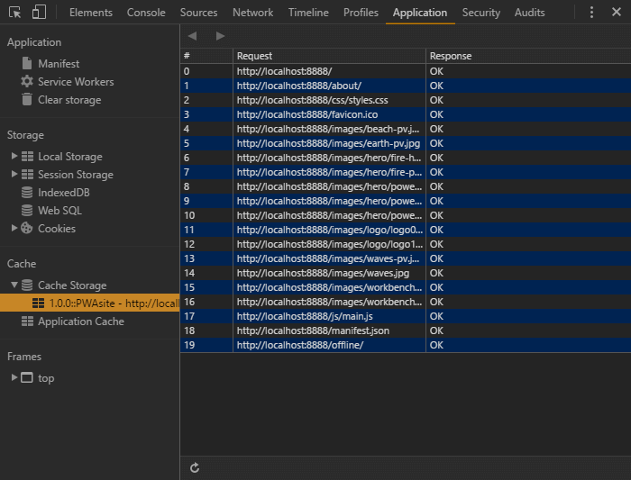 在main.js中我们可以使用 Cache API 。然而API 使用promises,在不支持的浏览器中会引起所有javascript运行阻塞。为了避免这种情况,我们在加载另一个 /js/offlinepage.js 文件之前必须检查离线文件列表和是否支持 Cache API 。