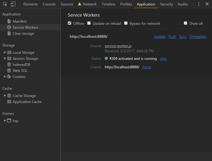 如果你觉得 javascript 调试困难,那么 service worker 也不会很好。Chrome的开发者工具的 Application 提供了一系列调试工具。