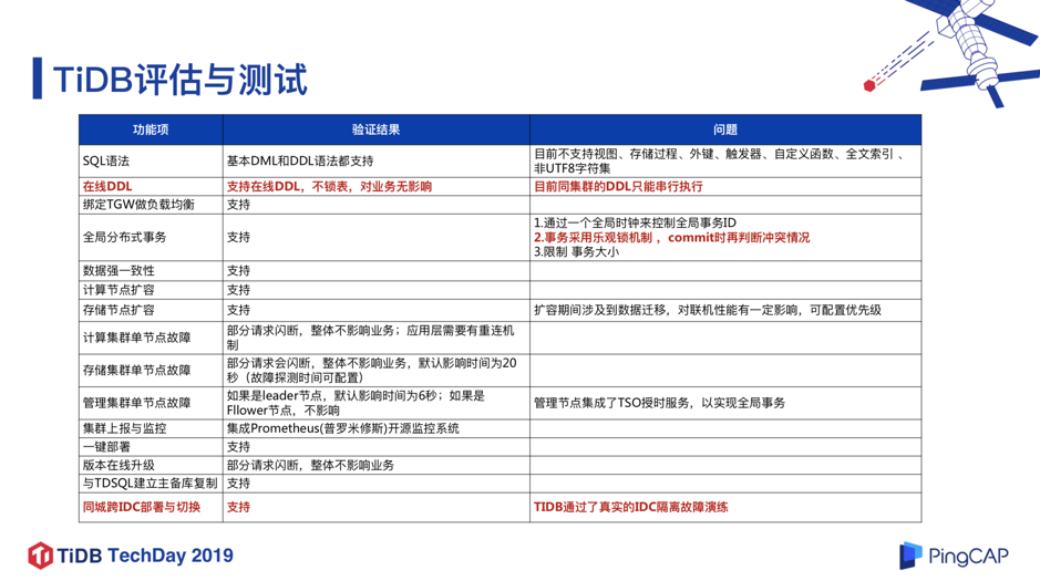 我们对 TiDB 做了一些评估和测试,对语法和 DDL、负载均衡、一致性、扩容等特性都做了很多测试。下面重点介绍以下 3 点: