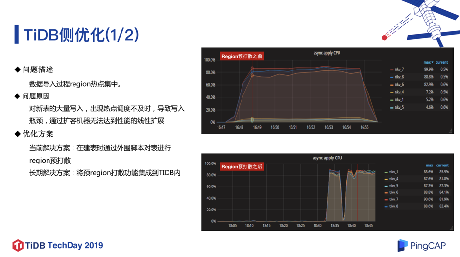 另外一个遇到问题就是无效 Region 过多的问题。前面提到,该业务数据在每天跑批完成之后需要删掉,第二天全部数据需要重新生成,所以该场景下每天都有大量的数据表删除和重建,会累积大量无效 Region,导致 PD 元数据管理压力过大,Region 副本之间的心跳也会大量增加 grpc 调用,导致整个系统运行比较慢。所以我们后来灰度上线了 Region merge 功能,这个功能在 TiDB 2.1.8 以后的版本中(含 3.0 GA)引入,