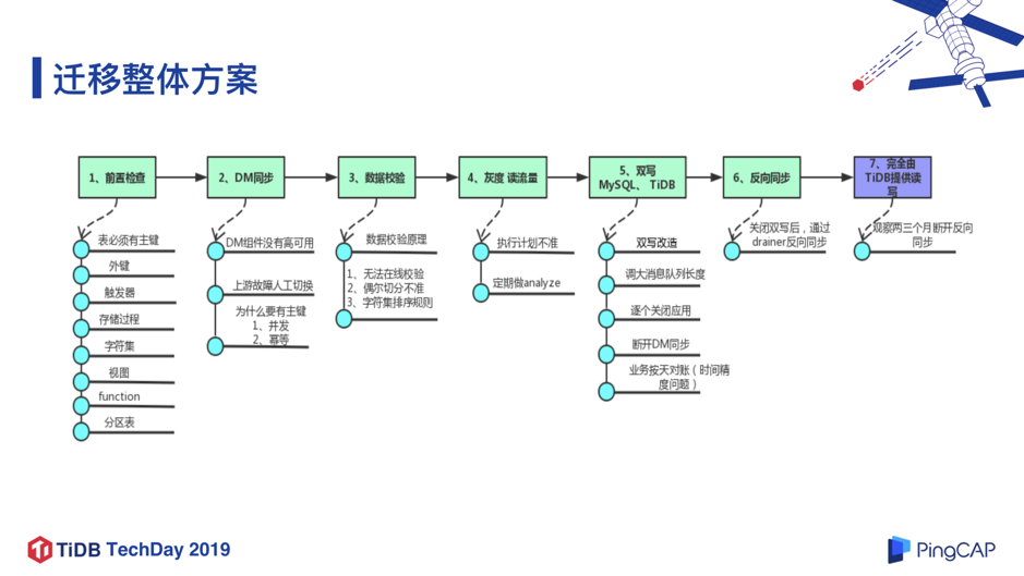 迁移整体方案如图 13,步骤流程比较长,但会更加安全。接下来介绍每个步骤中我们碰到的困难和解决方案。第一个步骤是前置检查。首先表必须有主键,如果是短时间海量连续写入,不建议用自增 ID,可以把自增 ID 改成由雪花算法生成,再把雪花算法的时间戳后几位提到最前面,这样可以保证主键足够随机 ,然后使用我们之前提到的 Split Region 的功能,提前把 Region 切分,并打散到所有的 TiKV 节点里,这样可以在写入的时候实现负载均衡,解决短时大量写入瓶颈问题。