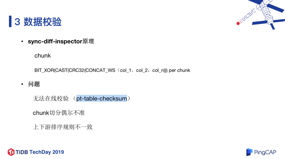 作为一个金融场景,尤其是异构的数据同步,数据校验是一个非常严肃的确认过程。熟悉 MySQL 的同学应该了解过 pt-table-checksum 工具,它的原理和 PingCAP 提供的数据校验功能类似,将这个数据切片之后,对数据切片进行 checksum 计算,然后比对上下游所有切片的 checksum 值是否一样来判断数据一致性;但是它当前还做不到类似 pt-table-checksum 的在线校验,如果上游 MySQL 的数据一直在变,就没办法做校验了。另外,Chunk 切分偶尔不准、上下游排序规则不一致,这两个问题已经在新版本有了优化。