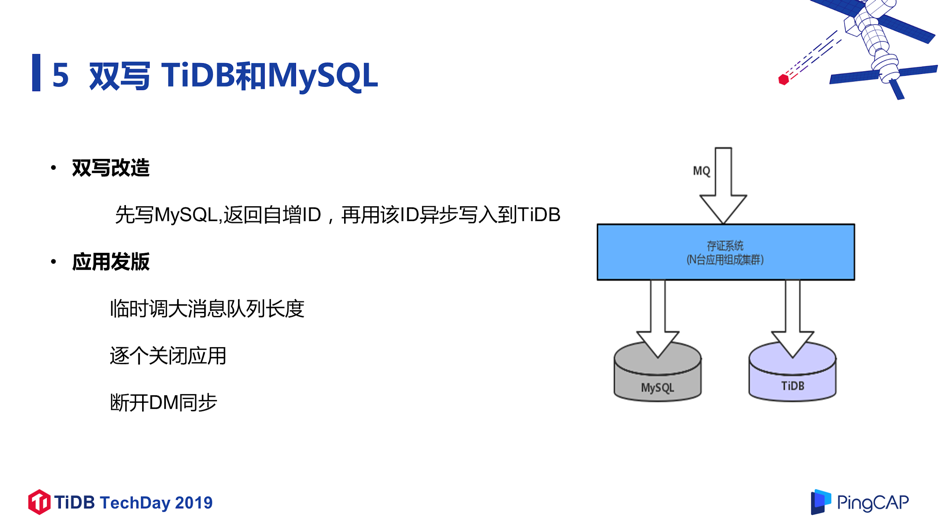 在读流量切换到 TiDB 没有出现什么问题之后,我们再把写流量切换到 TiDB,但也不是一次性切换,我们选择先双写 TiDB 和 MySQL:先写 MySQL 返回自增 ID,再用该 ID 加上业务数据异步写入到 TiDB;上下游的 ID 保存一致方便我们进行数据校验。在双写改造完成后,架构如图 18 所示。应用准备发版时,为了保证业务暂停的时间足够短,我们临时调大了消息队列 MQ 的长度,因为在整个应用关闭之后,消息队列仍在存储消息,可能会把消息队列存满。调大消息队列长度之后,再逐个关闭应用,等到所有应用都停掉后,在确认 DM 的数据同步已经追平后,就可以把 DM 断开,接下来就可以逐个启动新版本的应用了。业务停止时间(最后一个应用关闭到新版本第一个应用启动的时间间隔)控制在 1 分钟以内,对应用的影响非常小。