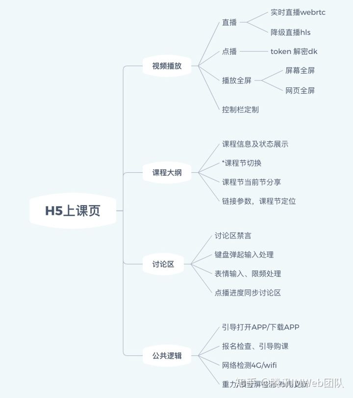 1.上课直播: 通过腾讯云WebRTC直播(优先方案)以及hls直播(降级方案)两种方式完成。 2.点播回放: 通过腾讯云TcPlayer超级点播的进行hls播放。 3.讨论互动: 基于impush,学生能发送和接收文案+表情。其余互动场景通过toast提示。 4.课程大纲: 查看课程每节的内容及时间,可在同一页面直接切换节进行直播/回放。