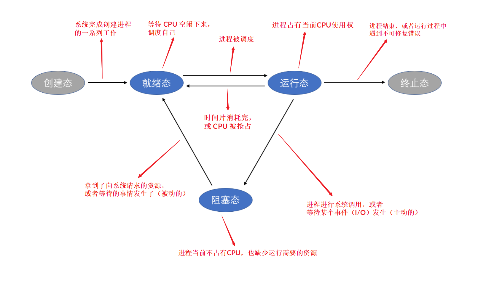 **⑤ 终止态(结束态):**回收为进程分配的资源,撤销 PCB