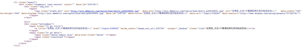 图片链接就在li这个标签下地img标签里.现在我们需要做的就是尝试着把这种类型的li从所有html中分离出来.我们可以看到li这个标签有个属性叫做class,这个属性的值是class="span3",我们把这段话li class="span3"