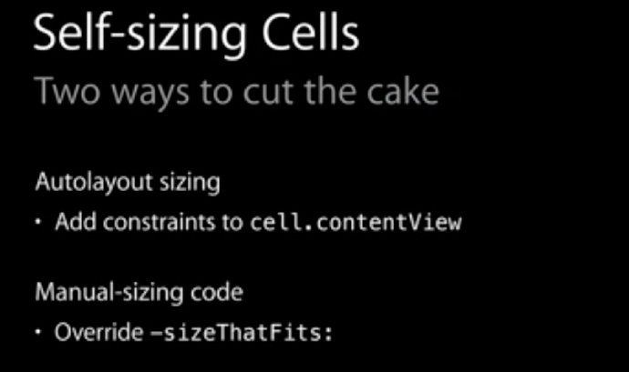 回到正题,iOS8 WWDC 中推出了 self-sizing cell 的概念,旨在让 cell 自己负责自己的高度计算,使用