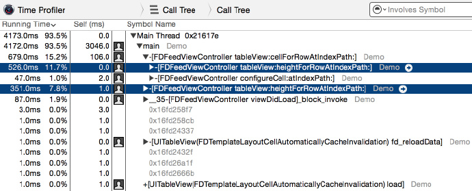 一个有 54 个内容和高度不同 cell 的 table view,从头滑动到尾,再从尾滑动到头,iOS8 系统下,iPhone6,使用 Time Profiler 监测算高函数所花费的时间: