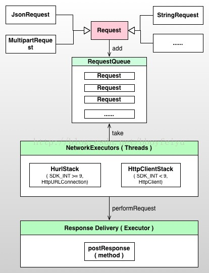 。第二部分的RequestQueue依赖于Request,Request是抽象的,因此任何Request的子类都可以传递到请求队列中来,它依赖的是抽象Request,而不是具体的某个实现,因此保证了可扩展性。你可以自己实现自己所需的Request,例如大文件的上传Request。同理,第三部分的NetworkExecutor也只是依赖于Request抽象,但这里又引入了一个类型HttpStack,这个网络请求的真正执行者,有HttpClientStack和HttpUrlConnStack,两者分别为Apache的HttpClient和java的HttpURLConnection,关于这两者的区别请参考:Android访问网络,使用HttpURLConnection还是HttpClient?。HttpStack也是一个抽象,具体使用HttpClient还是HttpURLConnection则由运行系统版本来定,HttpStackFactory会根据系统版本给框架返回对应的HttpStack。最后的ResponseDelivery比较简单了,只是通过Handler将结果投递给UI线程执行,也就是执行RequestListener的onComplete方法,此时网络执行完成,用户即可在该方法中更新UI或者相关的其他的操作。